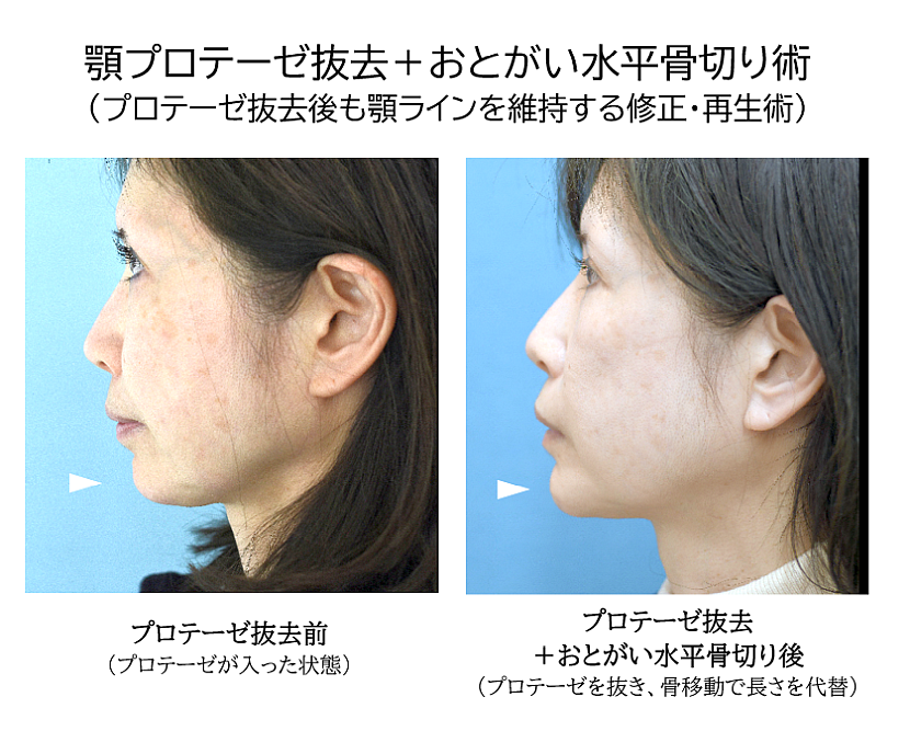 そこで今回は、プロテーゼ抜去と同時におとがい水平骨切りによって顎先を前方に出し、抜去前とできるだけ変わらない顎のラインに仕上げる形で施術を行うこととなりました。以下は術前後の変化となります。